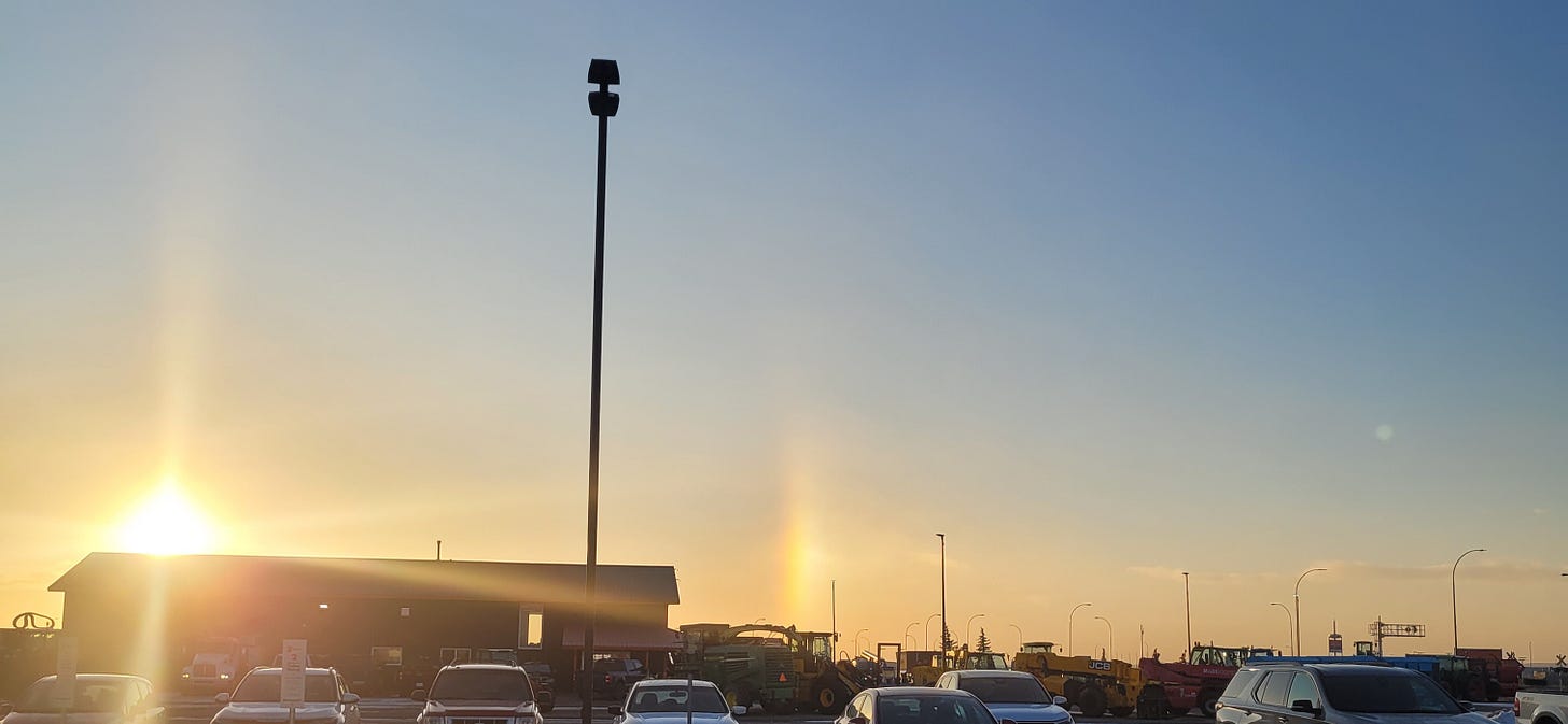 Early this morning, I took my children out to run an errand. As we paused at a stop sign, we noticed a vertical rainbow directly in front of us. Pink and yellow, blue light streaming straight into the sky, hovering over the earth. The low position of the sun sending light to bounce off the ice crystals in the air, forming this astonishing, icy rainbow. We sat in the parking lot for a few moments at our destination, looking at the rainbow, a sense of wonder pushing the entire car into silence as we just observed it.